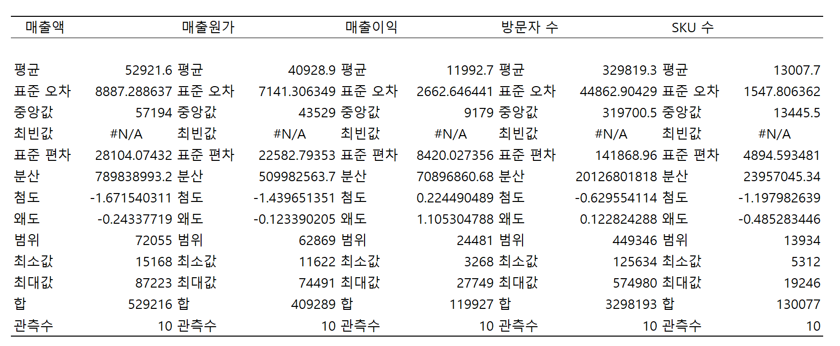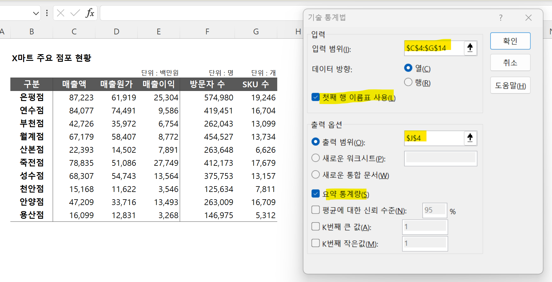 선택한 데이터 범위에 대한 기초 통계량 결과가 나옴