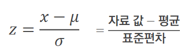 Z-Score : 자료가 평균으로부터 표준편차의 몇 배만큼 떨어져 있는지를 나타내는 지표