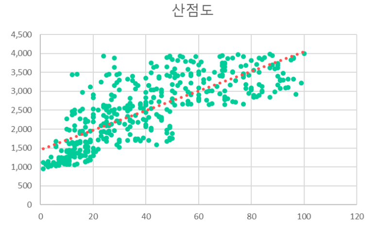 산점도 : 데이터를 점으로 표현해 흩어져 있는 정도를 파악하는 그래프